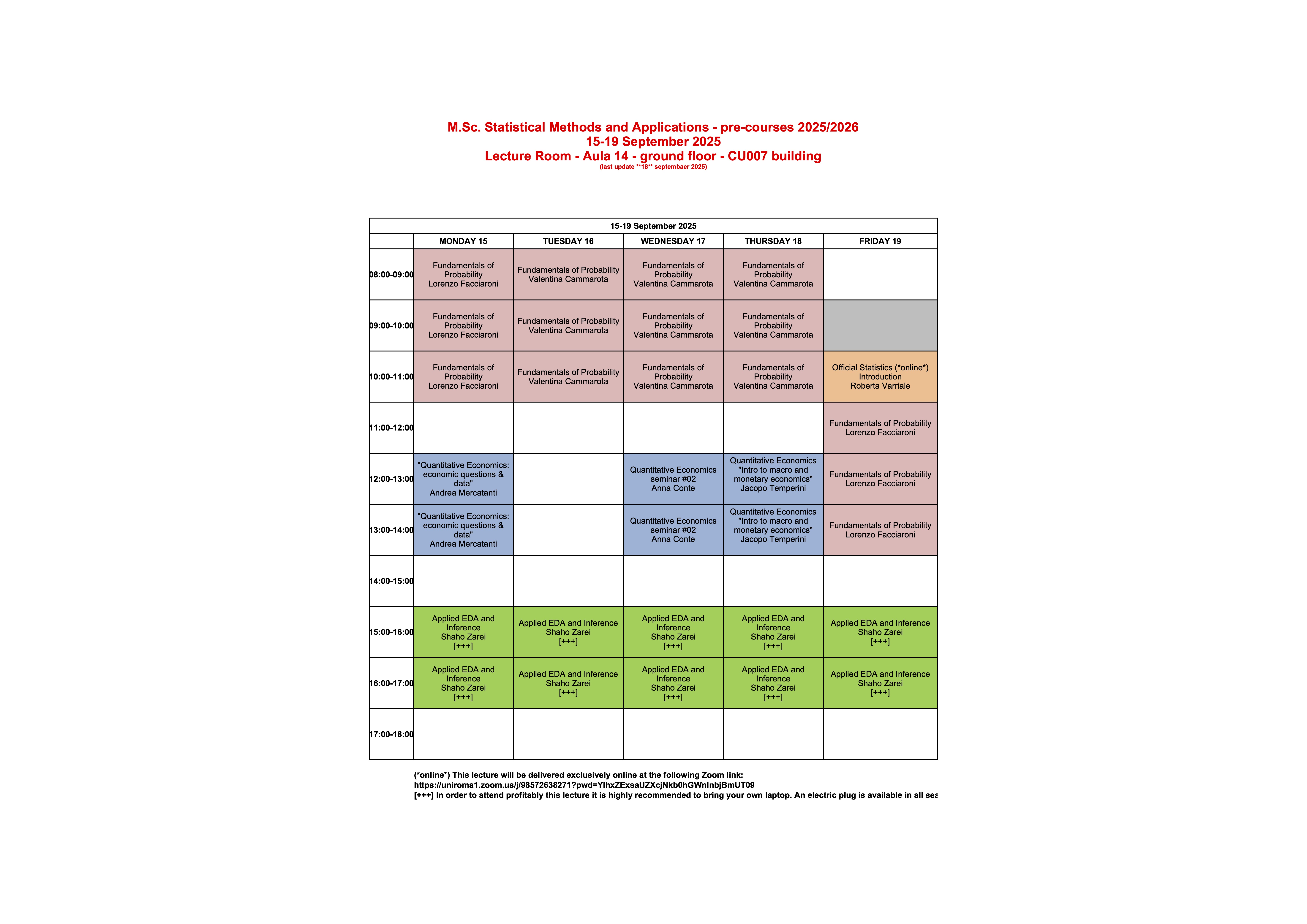 All first-year students are strongly recommended to attend the lectures in person according to the schedule below. This first week of classes will allow students coming from different academic backgrounds to share some fundamental knowledge of probability concepts, statistical analysis and programming skills. Moreover, there will be few interesting lectures on quantitative economics and official statistics.